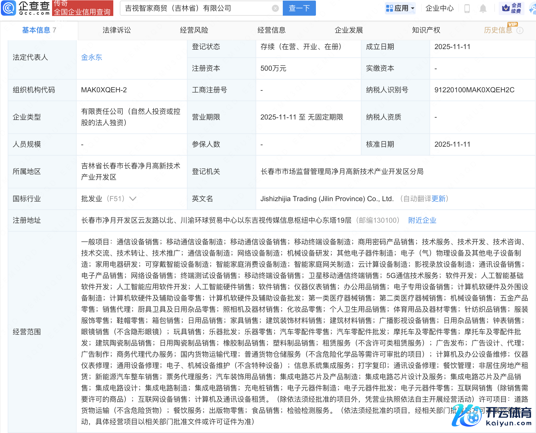 近日,吉视智家商贸(吉林省)有限公司确立,法定代表东谈主为金永东,成见领域包含:东谈主工智能基础软件设备;东谈主工智能讹诈软件设备;集成电路芯片及家具制造;集成电路缠绵等。企查查股权穿败泄漏,该公司由吉视传媒(601929)全资握股。