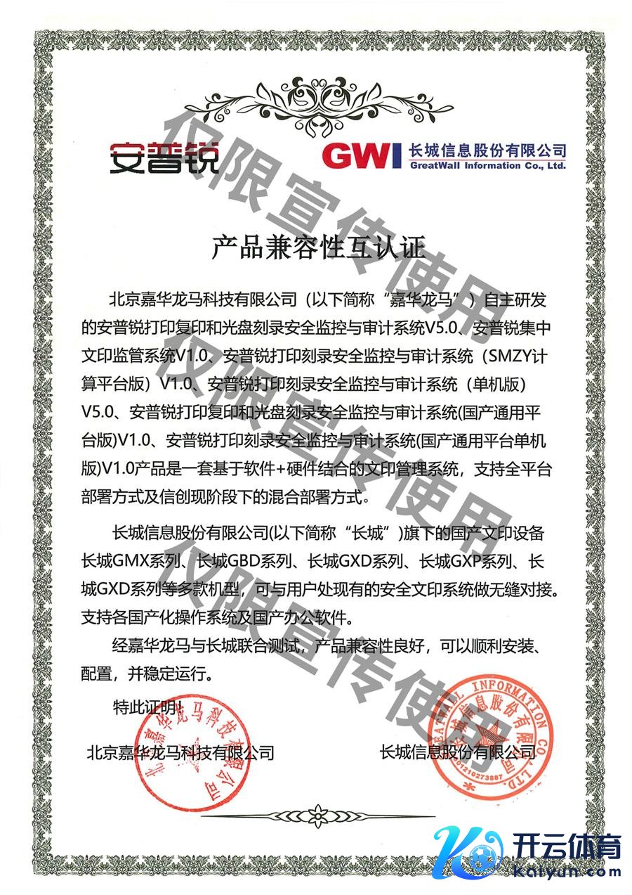 近日,北京嘉华龙马科技有限公司自主研发的安普锐打印复印和光盘刻录安全监控与审计系统、安普锐辘集文印监管系统、安普锐打印刻录安全监控与审计系统(SMZY预备平台版)、安普锐打印刻录安全监控与审计系统(单机版)、安普锐打印复印和光盘刻录安全监控与审计系统(国产通用平台版)、安普锐打印刻录安全监控与审计系统(国产通用平台单机版)与长城信息股份有限公司旗下国产文印建立长城GMX系列、长城GBD系列、长城GXD系列、长城GXP系列和北京金天城遮盖期间有限公司旗下国产安全文印建立金天城TC系列多款机型完成兼容性认证。
