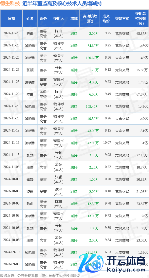 证券之星音信,把柄11月27日商场公开信息、上市公司公告及交往所泄漏数据整理,德生科技(002908)最新董监高及关系东说念主员股份变动情况:2024年11月26日公司董事,高管虢晓彬、董秘,高管陈曲、董事张颖共减执公司股份248.47万股,占公司总股本为0.5759%。变动时候公司股价下落1.4%,11月26日当日收盘报9.15元。