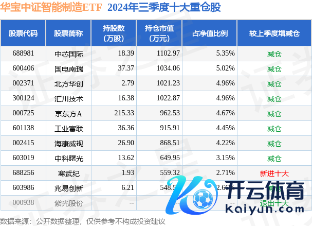 华宝中证智能制造ETF为指数型-股票基金,凭据最新一期基金季报表露,该基金钞票成就:股票占净值比98.63%,无债券类钞票,现款占净值比1.49%。基金十大重仓股如下: