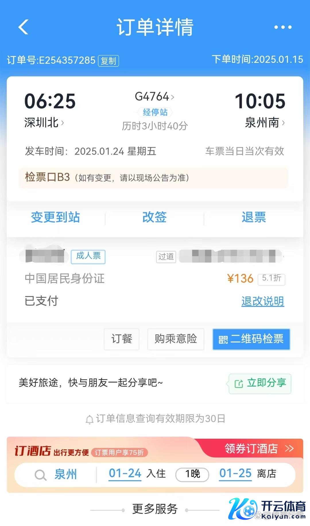 一个多小时后,他得知不错提前在农历廿五登程,何况观点地改为‘泉州南’更便捷他后续搭乘公交回家,于是我便在‘铁路12306’上帮他取消原先的候补订单,造成新的候补订单后又重新支付了‘深圳北-泉州南’的票价(只需136.00元)