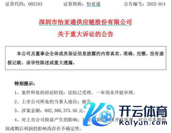2月23日晚间,怡亚通(002183)发布紧要诉讼公告。公司于近日收到广东省汕尾市中级东谈主民法院投递的诉讼材料,获悉公司及汕尾怡亚通与汕尾投控之间的合同纠纷一案已立案。公司动作被告,涉案金额8.82亿元。