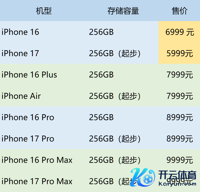 ▲iPhone 17系列与iPhone 16系列价钱对比