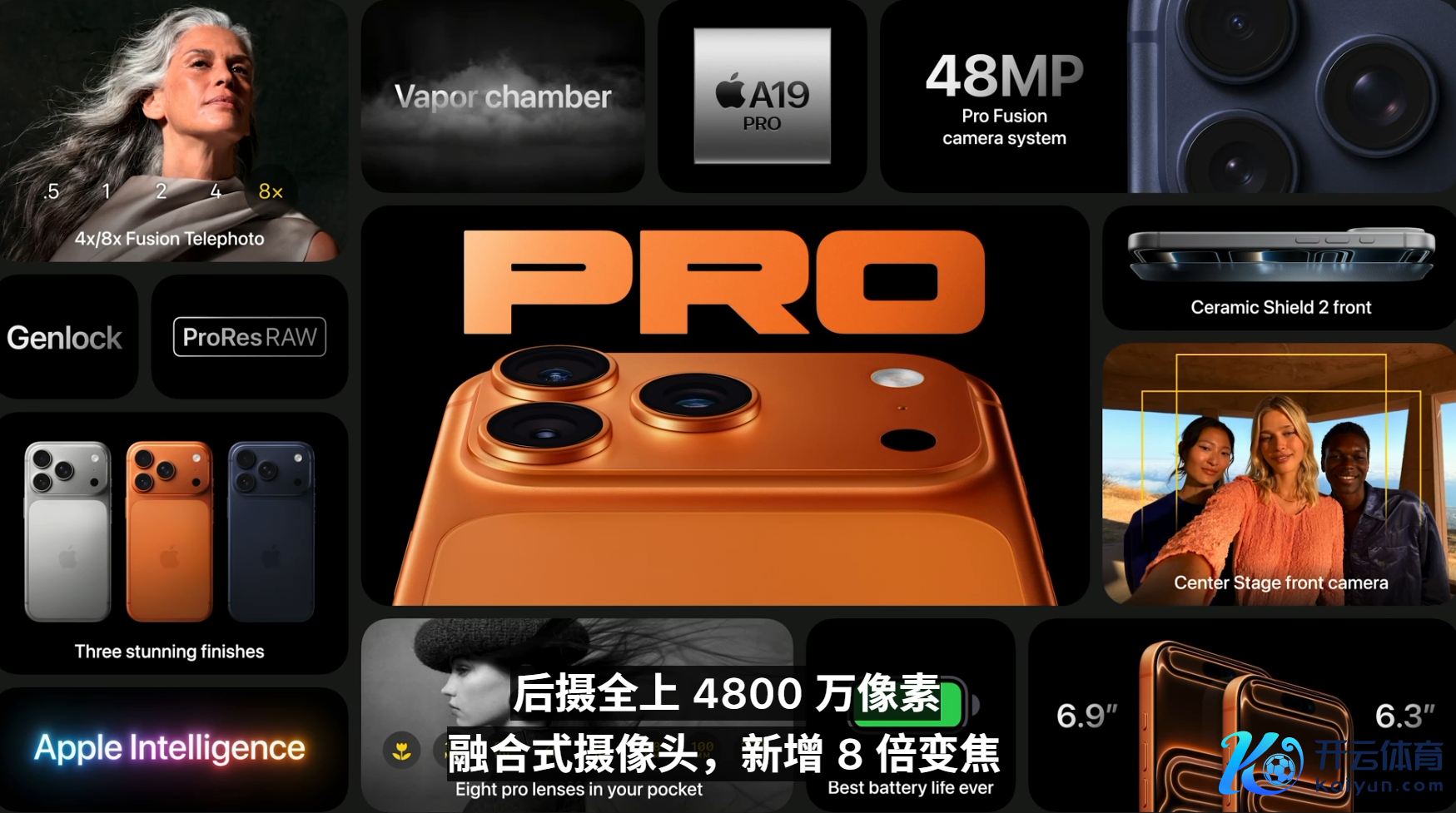 与Air比较,Pro版最中枢的升级主如若拍照和散热,后置三摄初度整个是4800万像素,长焦的新传感器大了56%,因循8倍光学变焦。用苹果的话来说,一部iPhone 17 Pro在手,堪比带了8颗专科摄像头,今天整场发布会都是用iPhone 17 Pro拍摄的。