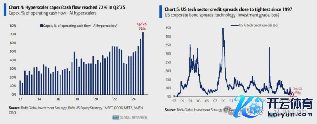 5.尽管AI界限正在进行大限制的“烧钱”,但债券投资者似乎并不担忧这会损伤关系公司的信用健康。一方面,AI巨头的成本支拨占其运营现款流的比例,已从2023年的35%飙升至2025年第二季度的72%,创下历史新高。但另一方面,好意思国科技行业的投资级公司债券信用利差却已收窄至65个基点,接近1997年以来的最紧水平。