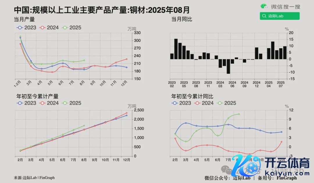 6.凭证国度统计局数据,8月份世界限制以上工业铜材产量为222.2万吨,同比增长9.8%,增速较上月8.3%的水平有所加速。2025年1至8月,世界铜材累计产量为1659.8万吨,累计同比增长10.7%。