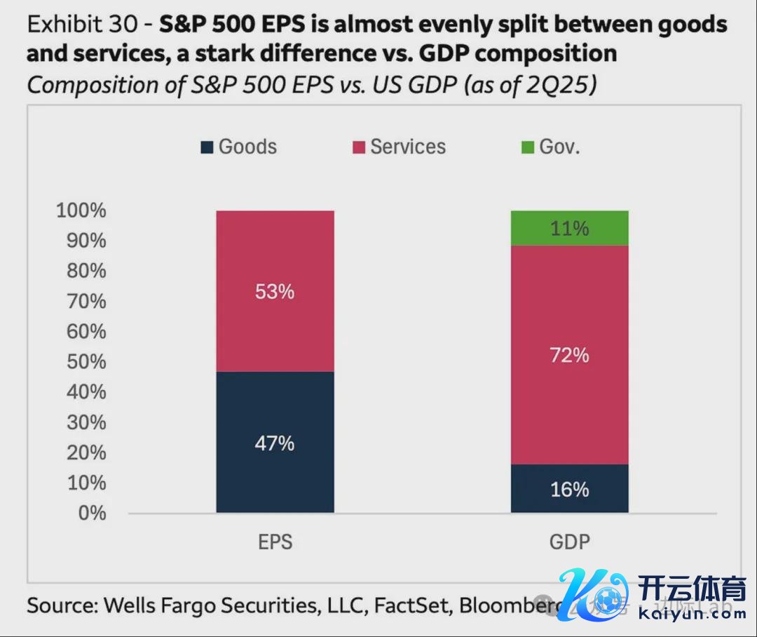 3.尽管服务业占好意思国GDP的比重高达72%,但其对标普500指数每股收益(EPS)的孝顺仅为53%。与此相悖,商品制造业在GDP中的占比虽仅为16%,却为该指数孝顺了47%的盈利。