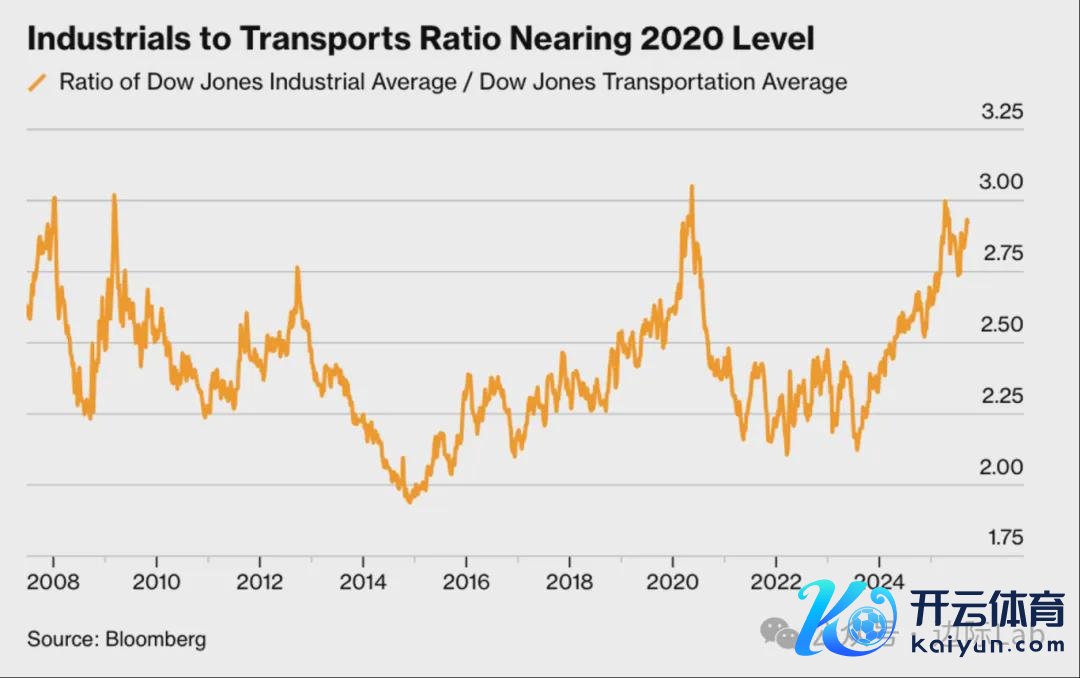 4.谈琼斯工业平均指数与谈琼斯运载业平均指数的比率正接近2020年的高点,这一权贵背离曾在2008年寰球金融危机和2020年新冠疫情崩盘期间出现,对现时创记录的股市反弹组成了潜在预警。百年历史的谈琼斯表面觉得,一个委果的阛阓趋势需要工业指数的走势得到运载指数的同步阐明,因为运载企业的发扬是意想经济健康景况的关节风向标。然则在2025年,工业指数连变嫌高,运载指数却发扬疲软,迟迟未能跟上门径。