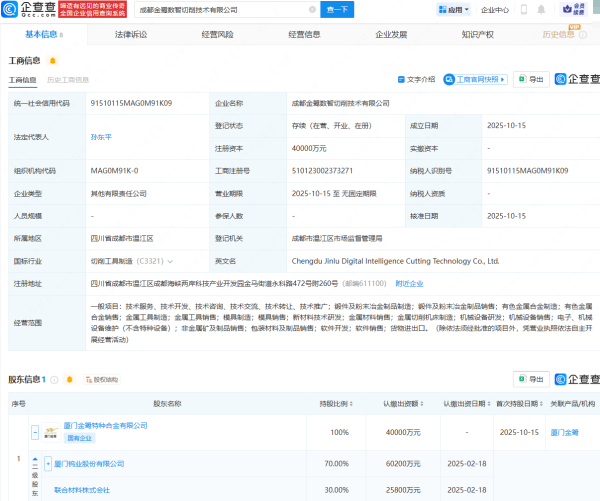 近日,成齐金鹭数智切削本事有限公司建树,法定代表东说念主为孙东平,注册成本为4亿元,计较范畴包含:锻件及粉末冶金成品制造;锻件及粉末冶金成品销售;有色金属合金制造;金属器用制造等。企查查股权穿透裸露,该公司由厦门钨业(600549)旗下厦门金鹭特种合金有限公司全资握股。 开云体育