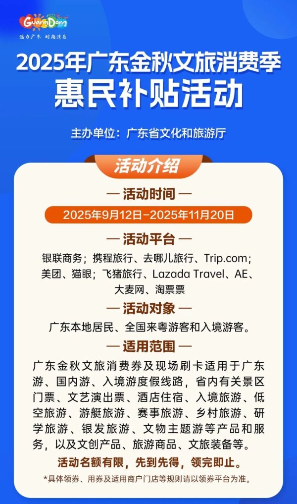 9月起 广东将披发 2000万元文旅浪掷券 8月26日 广东省文化和旅游厅 在广州举行 2025广东文旅推介大会系列活动 新闻发布会 据悉,为切实开释文旅浪掷后劲,广东省文化和旅游厅筹谋自9月12日起开动“金秋文旅浪掷季”惠民补贴活动,安排2000万元专项资金,面向广东土产货住户、世界来粤搭客及入境搭客披发文旅浪掷券。 披发2000万元 金秋文旅浪掷补贴 主理方开辟 两大专场罢了精确惠民 01 旅博会专场 公众可通过“云闪付”APP、“广东文旅”微信公众号领取浪掷券并线下核销,或在旅博会现场刷